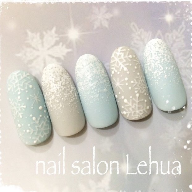 雪の結晶をマットに仕上げたネイルデザインです。細かく散った粉雪が印象的!ホワイトクリスマスになるよう、願いをこめて…♡