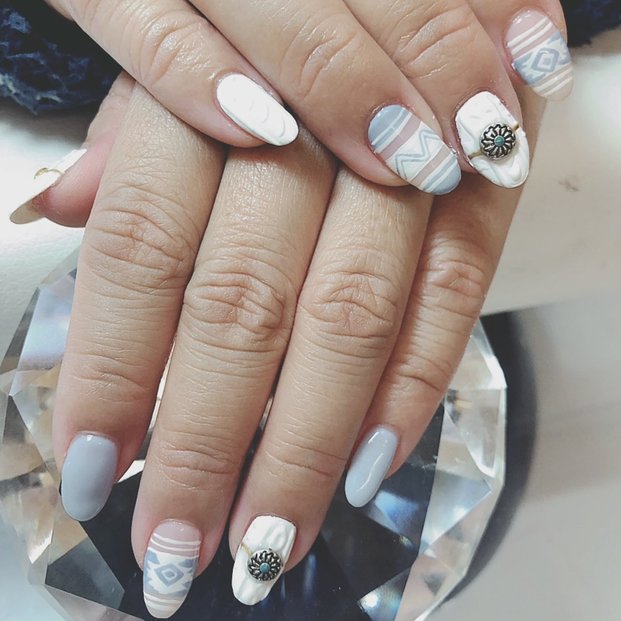ホワイトと淡いブルーカラーでまとめれば、冬らしいアイスカラーネイルにまとまります。コンチョをプラスすれば、ネイティブなムードもぐっと増しますね。