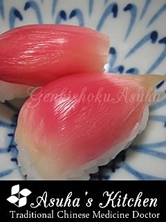 甘酢漬けにしたみょうがをお寿司のネタにしたものです。きれいなピンクがお料理を上品に仕上げてくれますね。シンプルだけれど、お腹にも優しい一品です。