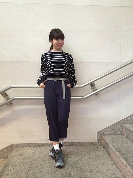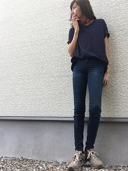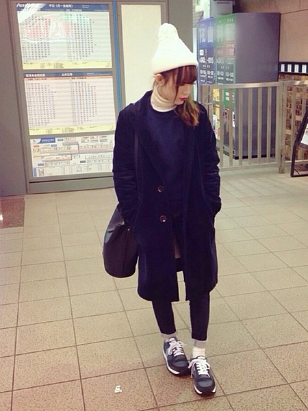 全体的にネイビーでまとめたコーデ。足元はしっかり目立っています♡