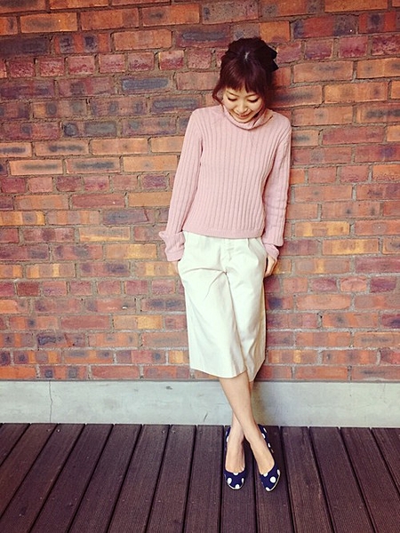 スモーキーピンクのハイネックニットは