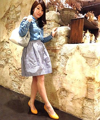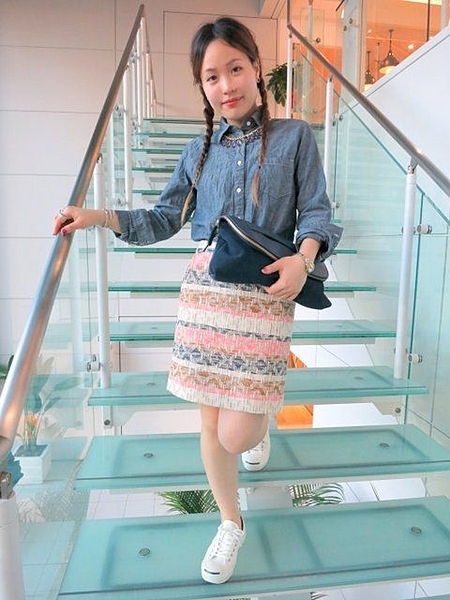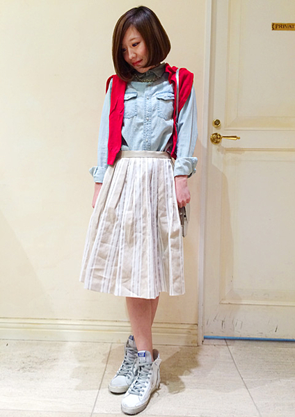 ビジューがついたダンガリーでスカートスタイルも可愛く着こなせる。女性らしさも忘れないコーディネートが出来るのでひと味違うダンガリーで他の子と差をつけれちゃうのが嬉しいですね☆