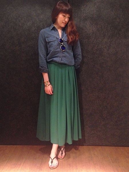 シフォンとダンガリーの究極コラボ。カッコよくも上品にもカジュアルにも幅広く使えるアイテム!ホワイトデニムと合わせてデニムアンドダンガリーコーディネートにも◎