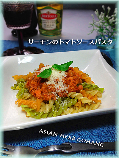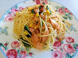 ■焼き鮭でリメイク・鮭とほうれん草・コーンのパスタ