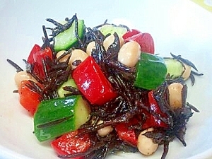 ヒジキと大豆の栄養満点レシピ。パプリカときゅうりで見た目も綺麗ですね。