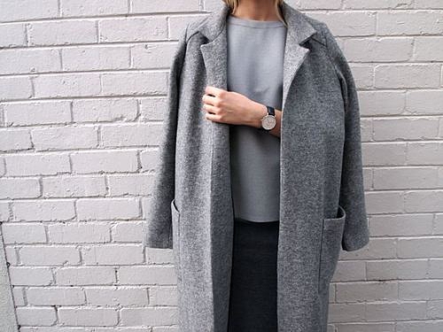 モノトーンコーディネートにグレーのアウターを合わせれば、ラフなこなれ感が出る。