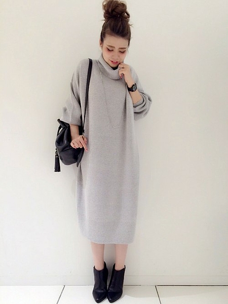 ゆったりニットのワンピースをさらっと1枚で着こなす。