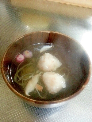 とても簡単につくれる海老しんじょうのお吸い物です。彩りをよくするために、ネギやお麩は入れたいところ。