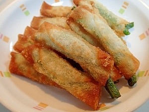 さやいんげんとチーズを餃子の皮で巻いて揚げました。