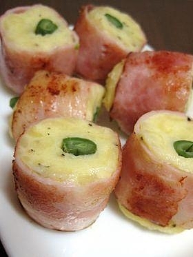 楽天レシピ:「ポテトいんげんのベーコン巻き 」より