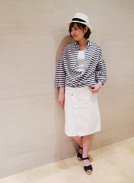 ふんわりギャザースカートと合わせるとマリンテイスト漂う甘口スタイル。