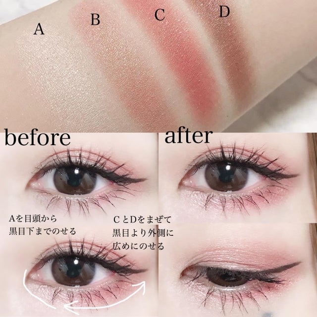 ② CのメインカラーとDのブラウンを混ぜて、黒目より外側に広めに乗せる(Bを涙袋に乗せても可愛い♡)