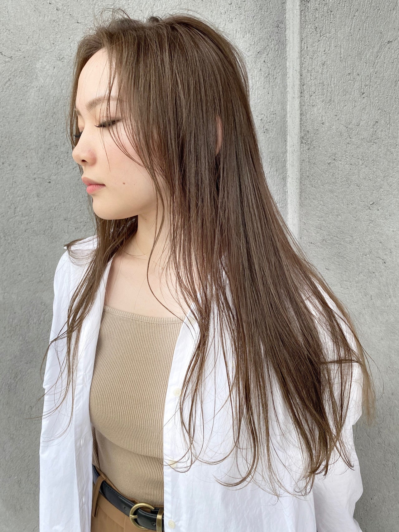 毛先に向けて髪の量を調節したら、ベージュ系のカラーとハイライトで抜け感を演出。ロングでも重くならずに軽さが出るので、暑苦しく感じません。おでこをスッキリ出して、サイドへ自然につなげます。