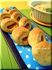 楽天レシピ:「HBで作る強力粉100%のチーズ入りベーコンエピ 」より
