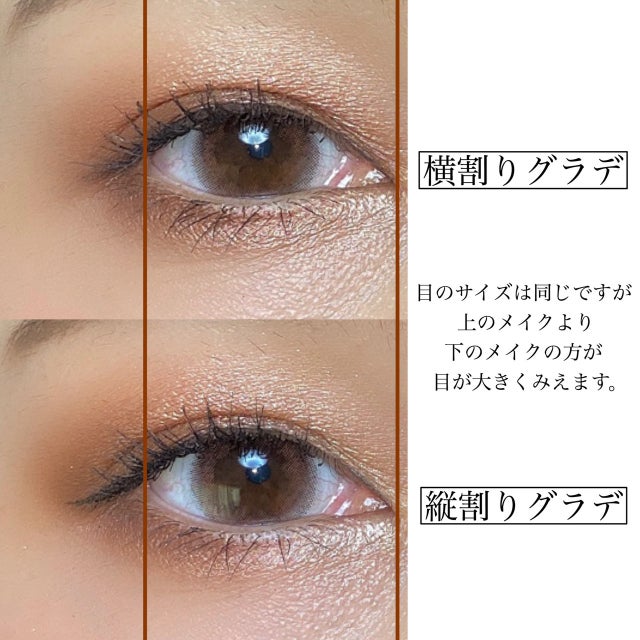 同じアイシャドウ、同じ目の大きさで比較してみましたが、縦割りグラデメイクのほうが目が大きく見えます!