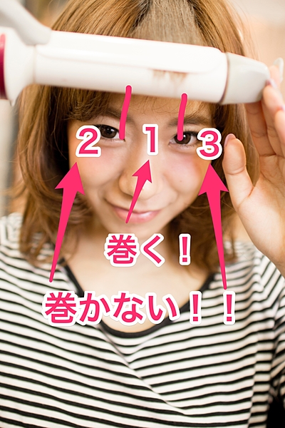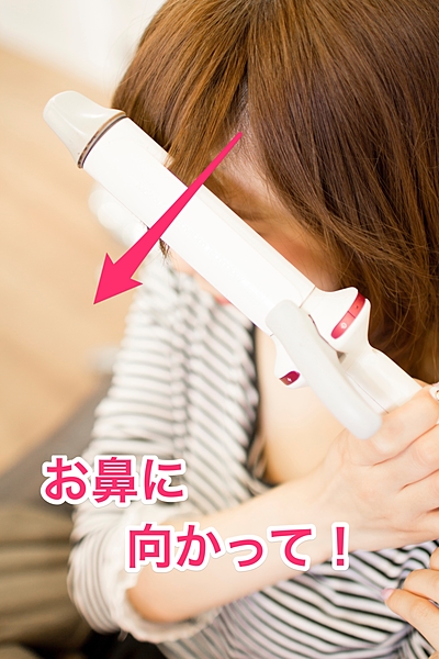 2、3の前髪の端は下にさげてコテを縦気味にしてお鼻に向かってコテを通してあげてください!!