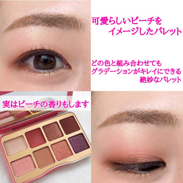 ①④⑥がマットタイプで②③⑤⑦⑧がシアータイプ。1つのパレットで2種類の質感を楽しめます。ピーチを連想されるような可愛らしさがギュッと詰まったパレット。