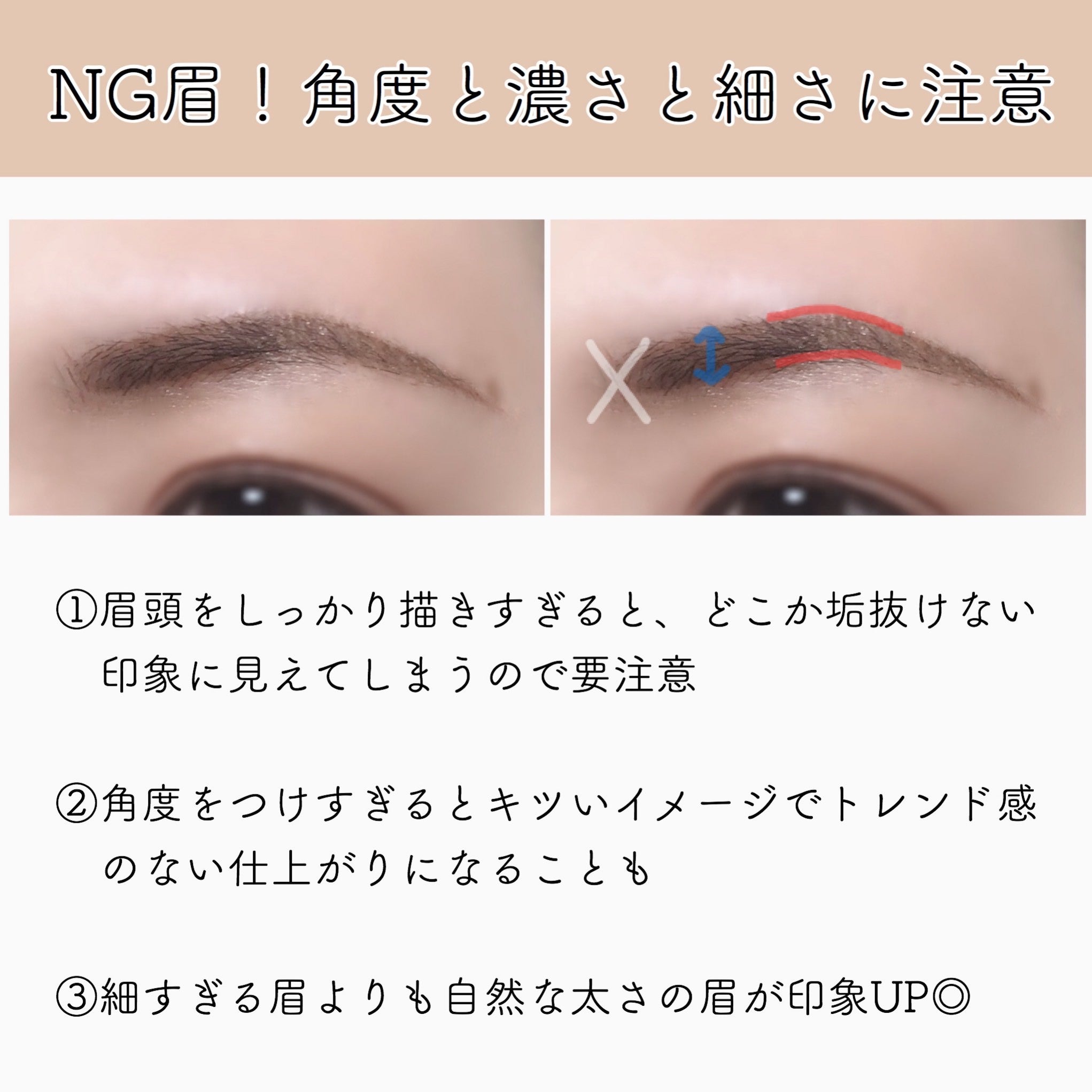 角度がつき過ぎた細過ぎる眉や全体が均一で立体感のない眉は、トレンドとは離れた雰囲気になってしまうので要注意です。