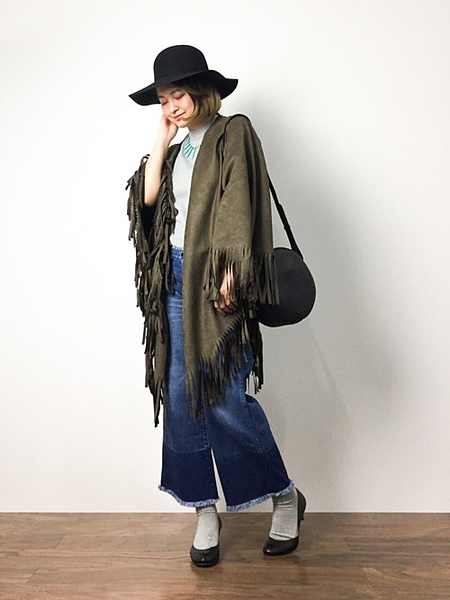 ポンチョやレザーを羽織るコーディネート。
