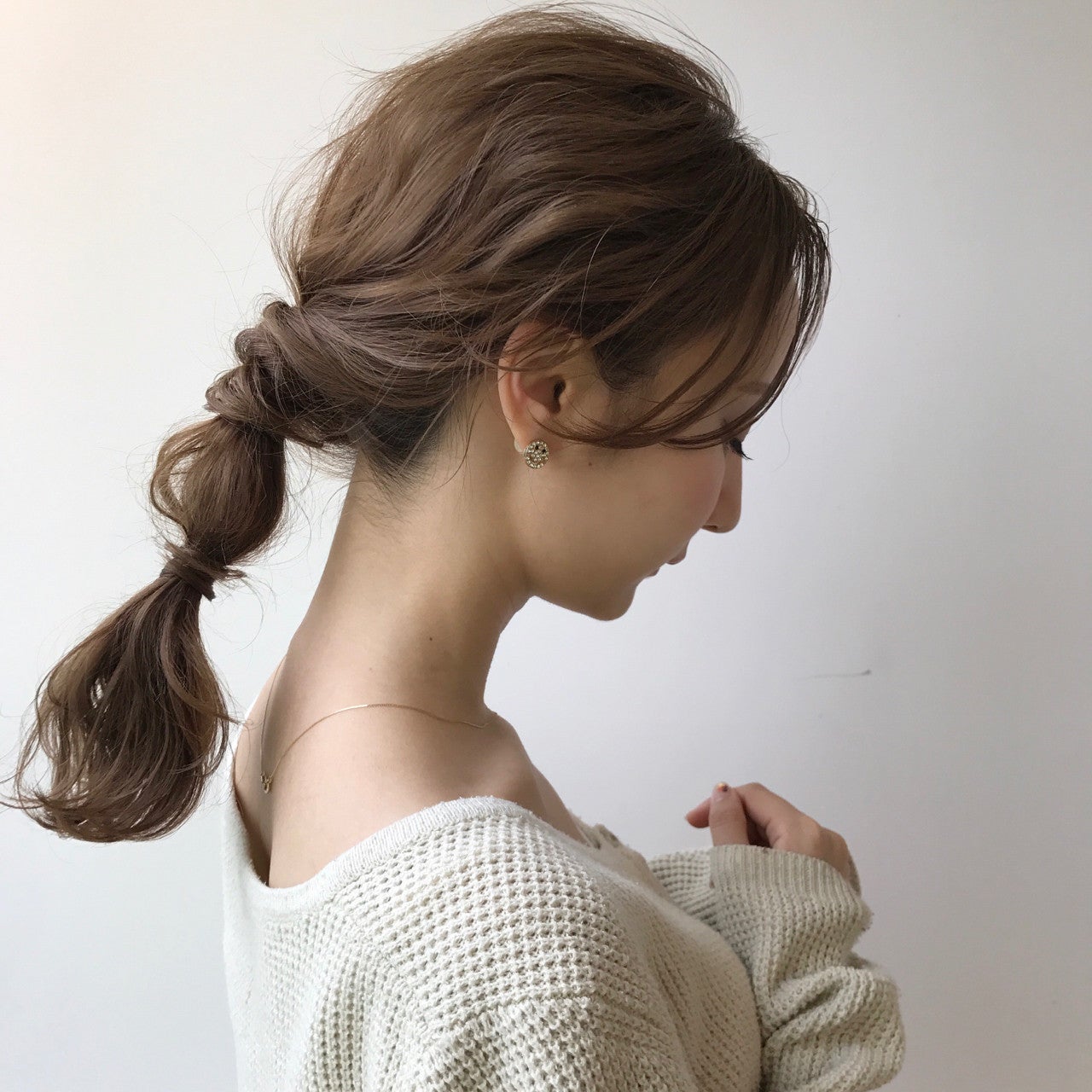 全体をウェーブで巻いてねじねじと巻きながら後ろで一つにまとめれば、大人っぽい雰囲気に。 しっかり首元のラインが見えるので、色気のある上品なニュアンスポニーです。首元にアクセサリーをつけてもかわいいですね。