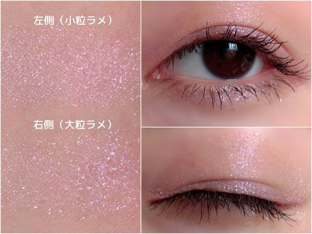 色は付かず、ラメのみを楽しむことができるアイシャドウです。左が小粒・右が大粒と大きさの違う2種類のラメが1つになっています。