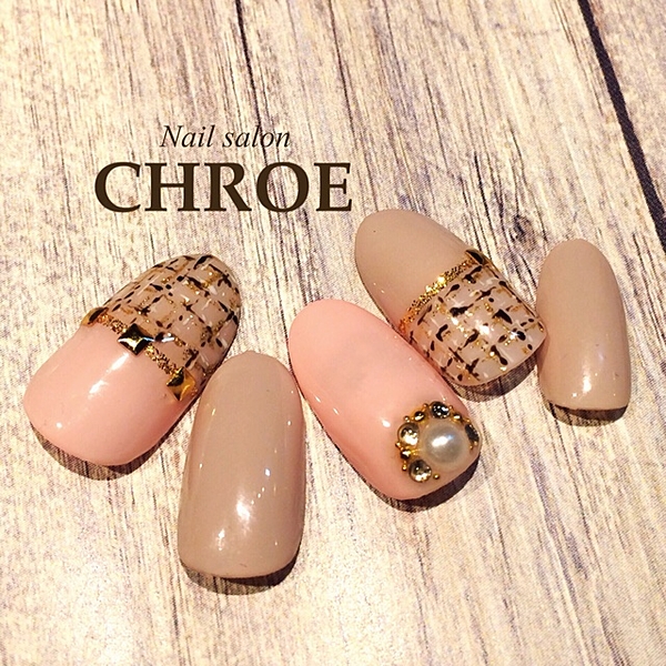 ベースカラーがオシャレ!小さめのパーツをちょっこっと乗せて、上品なツイードネイルの完成です。