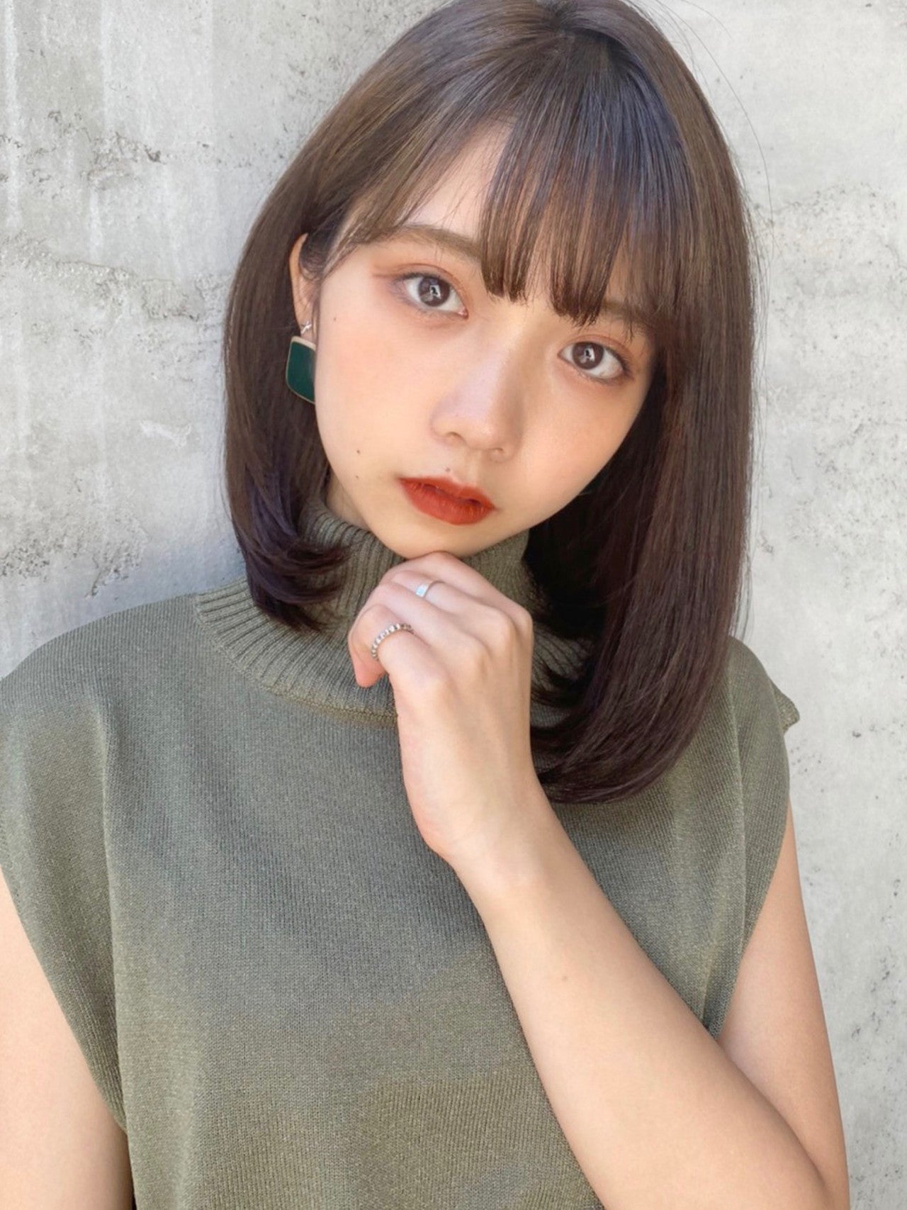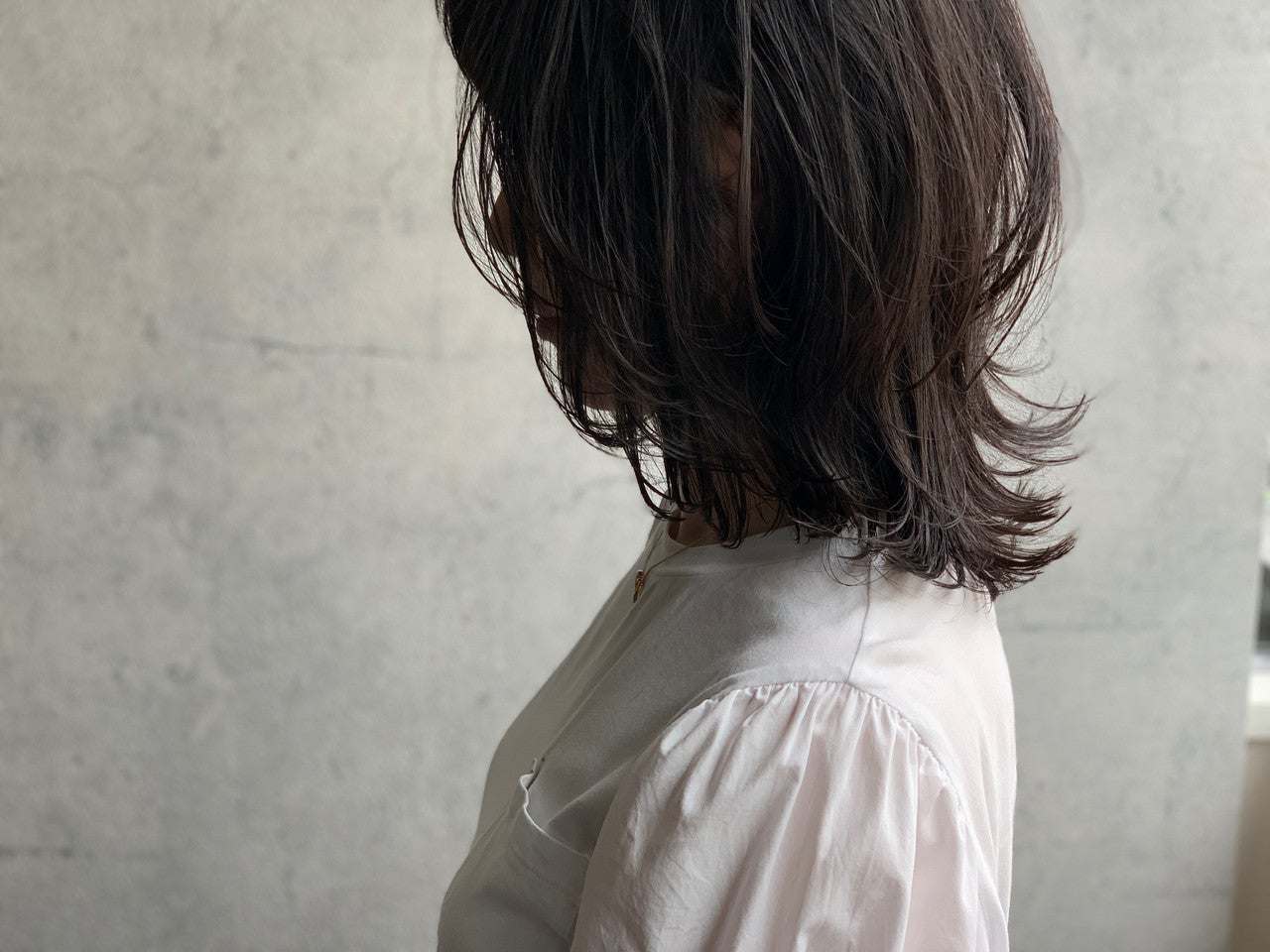 首回りがキュッとくびれたシルエットのミディアムヘア。