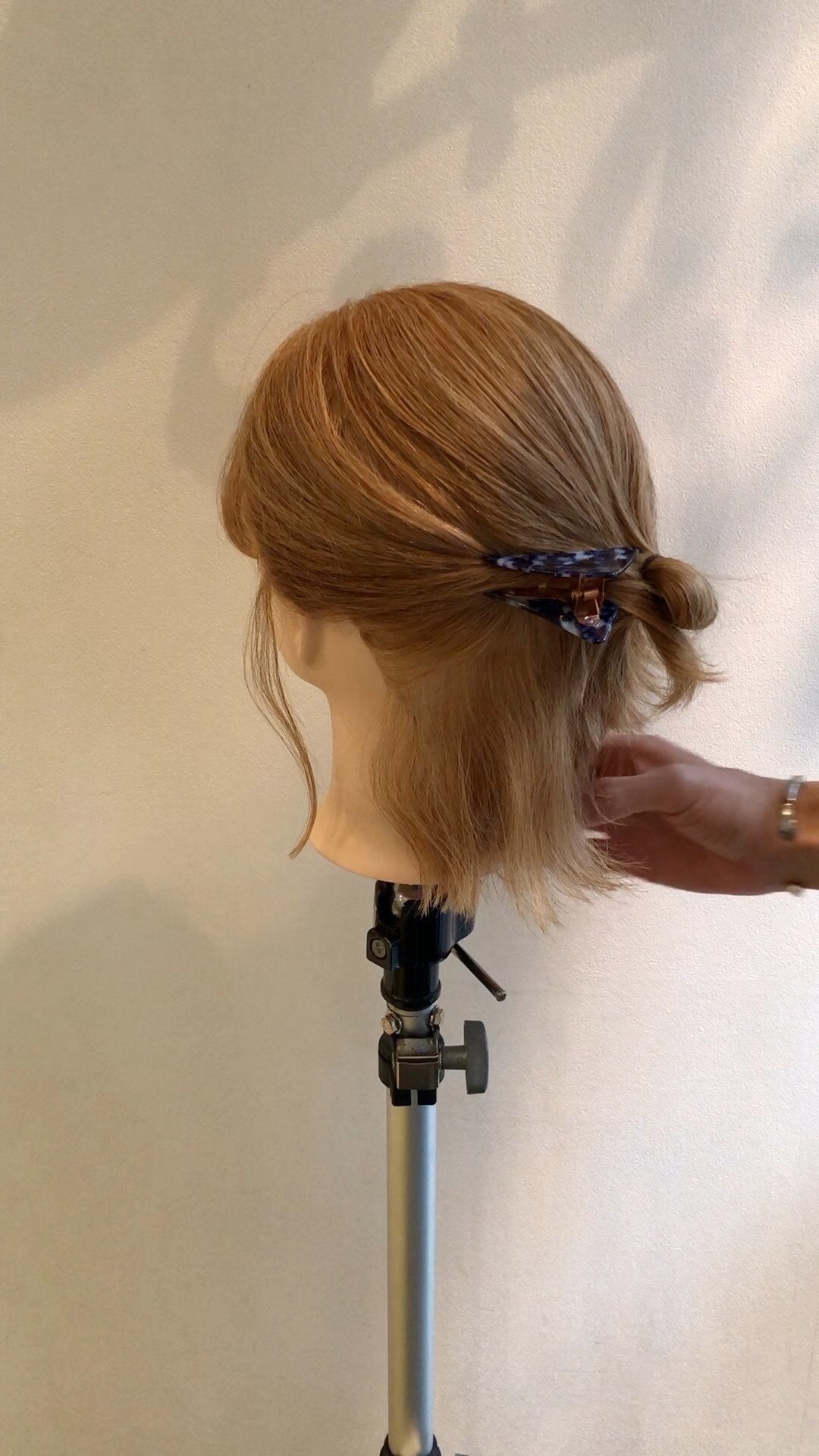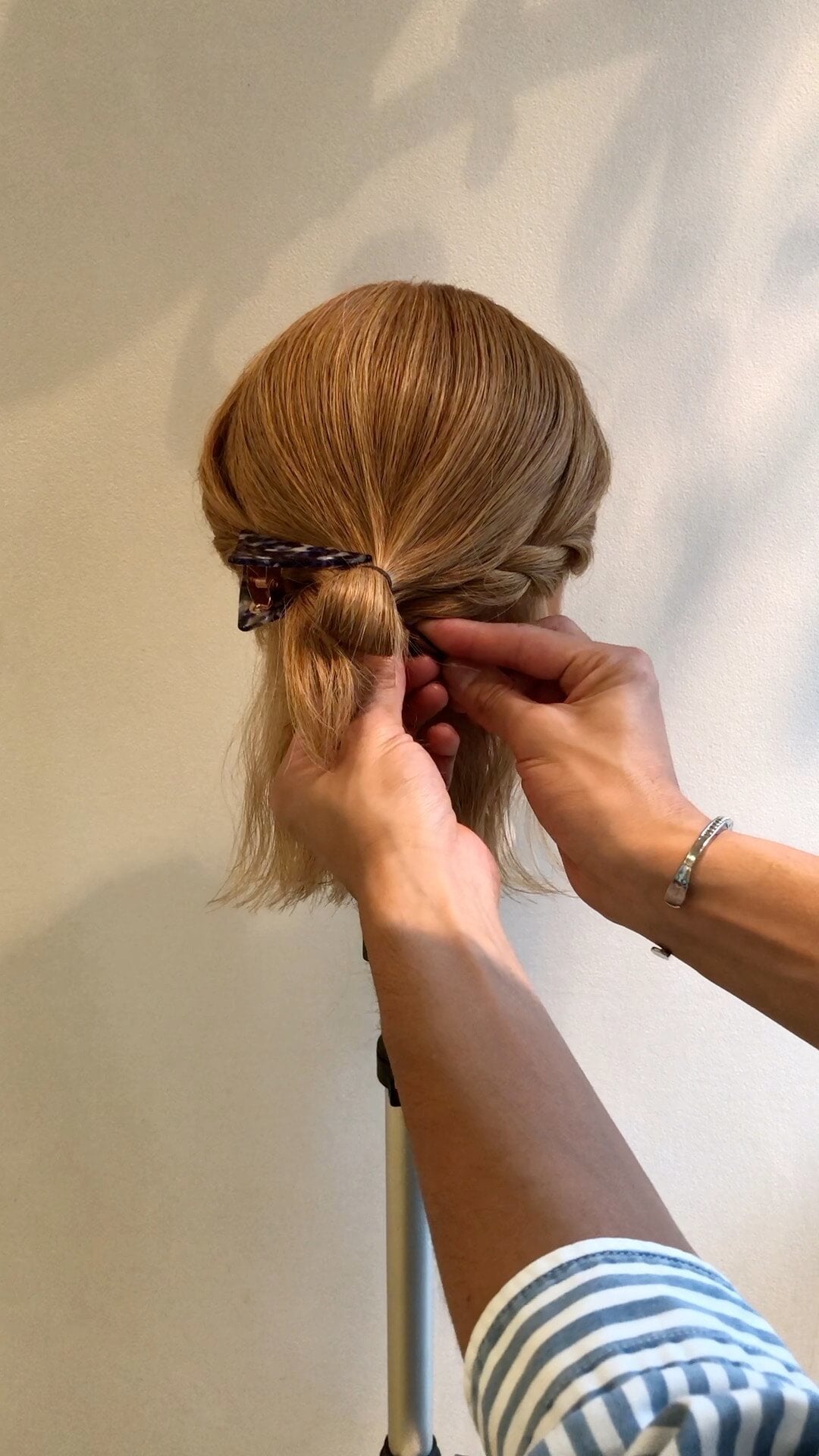 ③ すでにお団子にして固定されている髪の毛と、すくってねじった髪の毛を三角クリップでとめます。(お団子近くの髪はできるだけ深めにすくっておきましょう。)