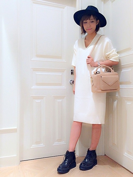 白のワンピースに黒の小物で
