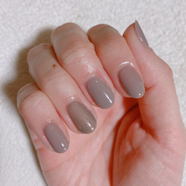 夏のファッションをピリリと引き締めたいときに便利なのが、こちらのN21。N45よりも少し濃い、落ち着いた雰囲気のグレージュです。薬指のようにラメをさり気なく重ねると、上品さがさらに引き立ちます。