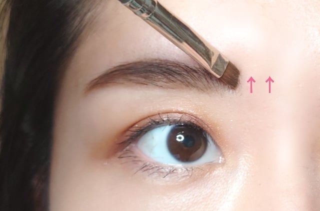 この部分は、くっきり形を付けたり濃く色をのせ過ぎるのではなく、毛流れに沿って上方向に眉を書き足します。