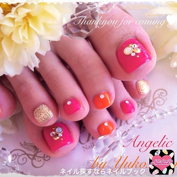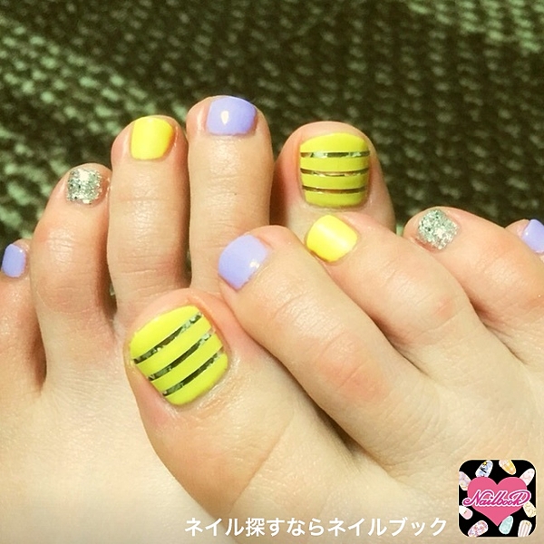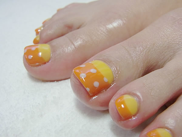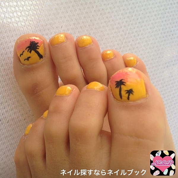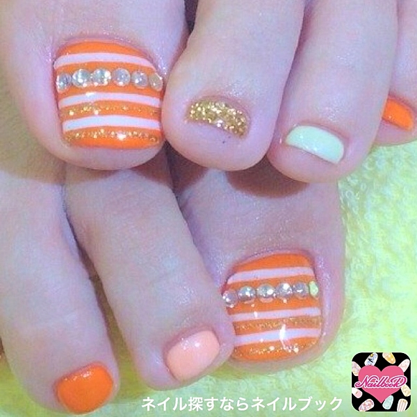 イエロー×オレンジの組み合わせって意外と珍しいかも!フットネイルはぱきっとお目立ちカラーで◎