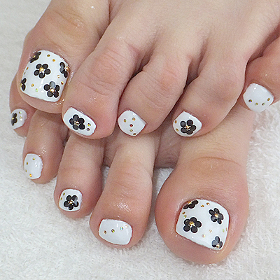 細かく散らしたお花が素敵なフットネイルデザイン。