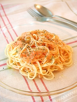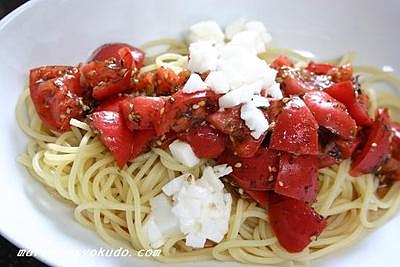 楽天レシピ:「簡単混ぜるだけ♪ 完熟トマトの白だし冷製パスタ 」より