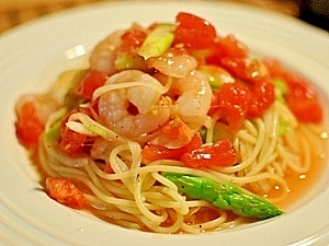 さっぱり♪トマトとアスパラとエビの冷製パスタ