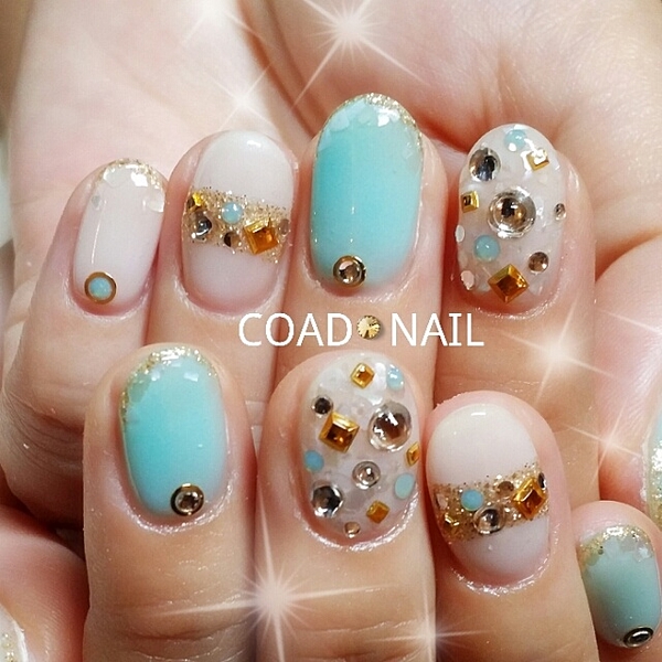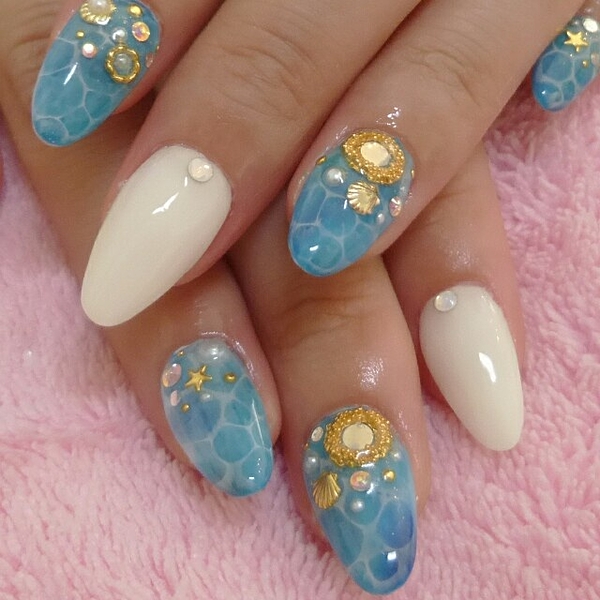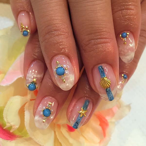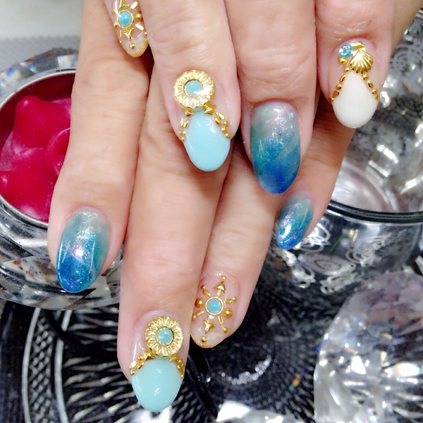 落ち着いたトーンのターコイズブルーは、ゴールドやカラフルな貝殻モチーフと合わせて☆大人な派手ネイルを実現させちゃおう!