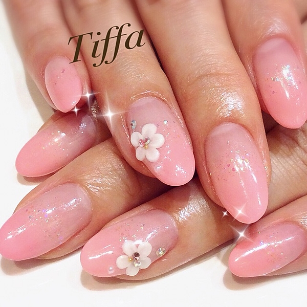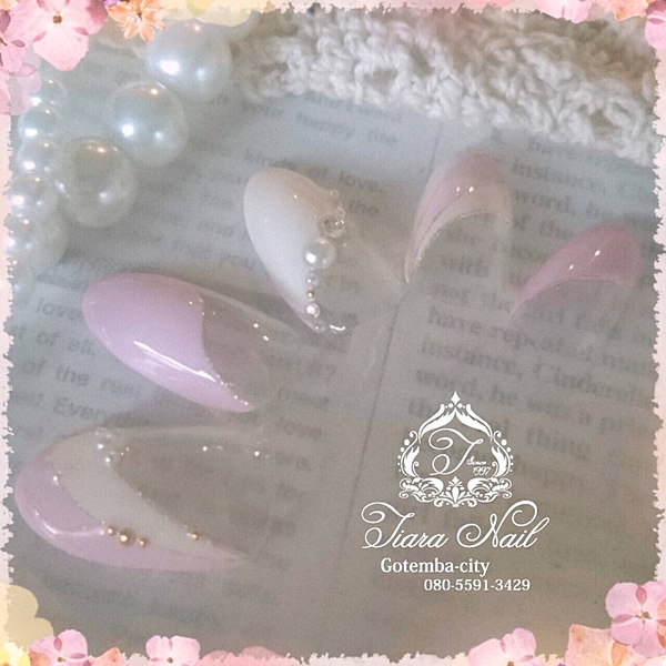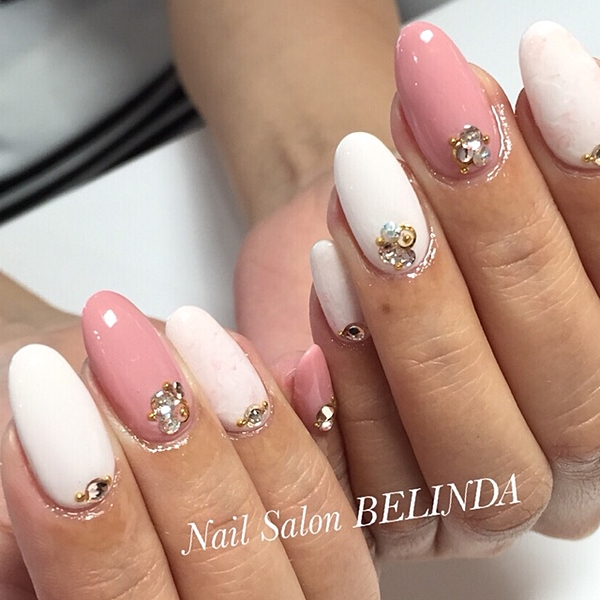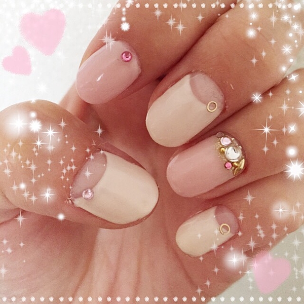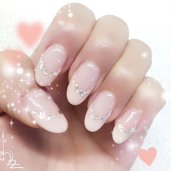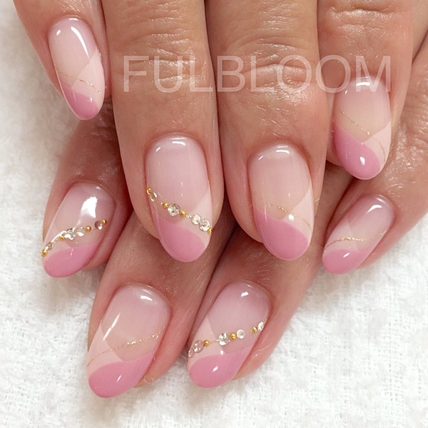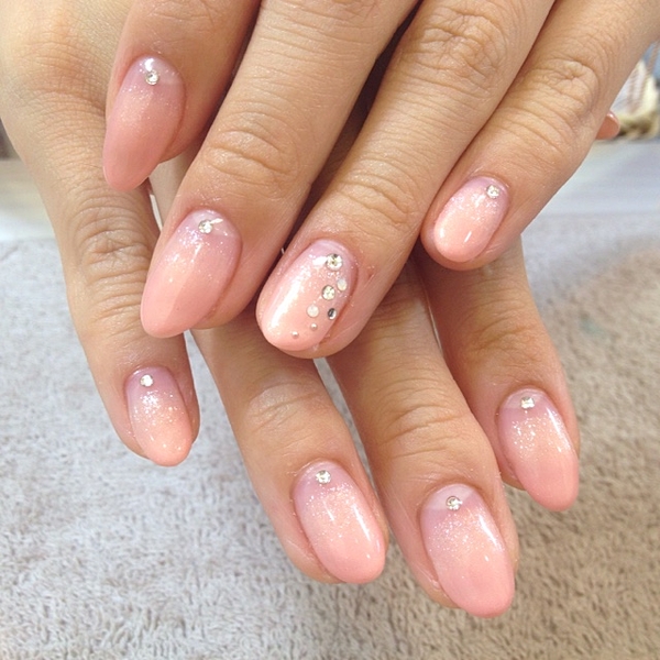 ピンクベースにクリアストーンをのせると、透明感のあるきれいな指先に見せてくれます♪