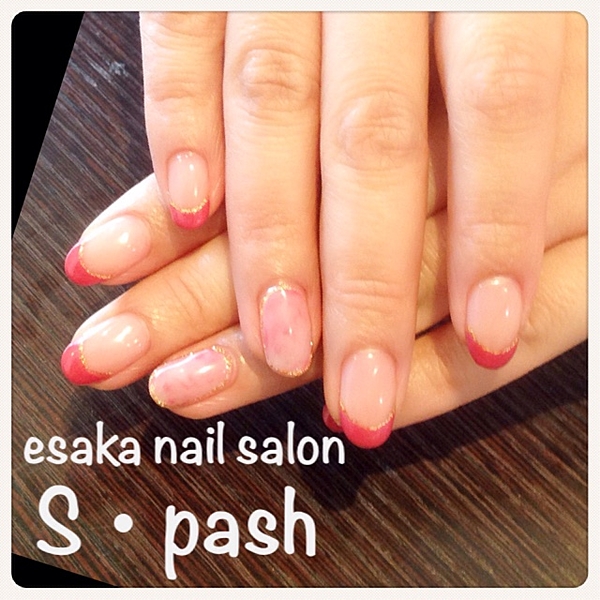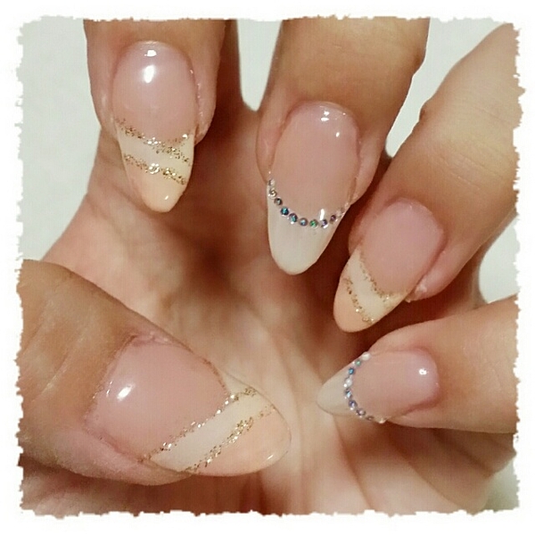 ピンクでシンプルフレンチにして、ゴールドのラメラインをプラス