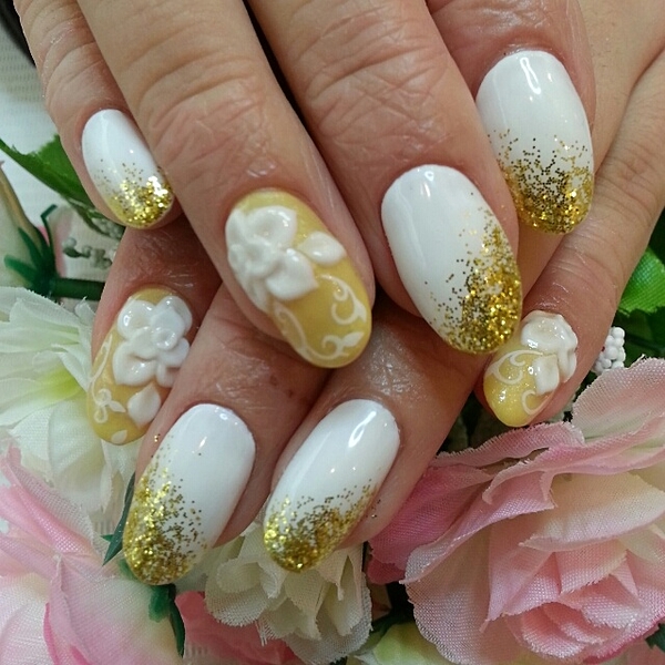 細かい金ラメベースに黄色いハートラメ、シルバーと金の星型ラメ、金スパンコールラメ入っているからこれ1本で大活躍!和装にオススメのゴールドです♡