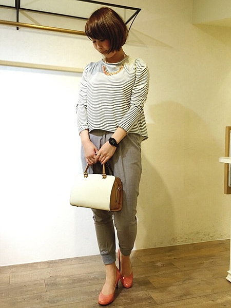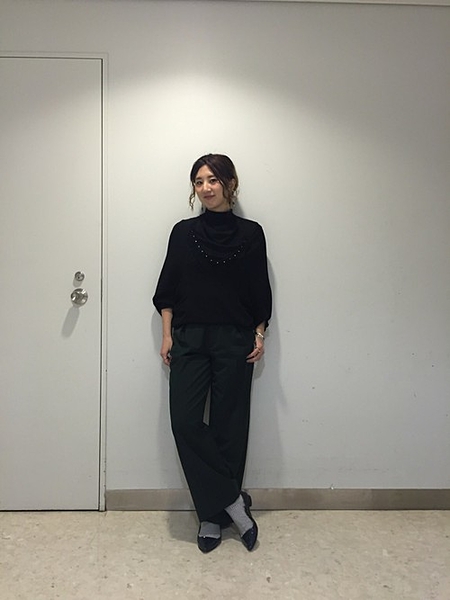 こちらの方のコーディネートは、オフィスコーデだけれどちょっとラフな感じ。スウェットパンツなどと相まって、トゥのまるいバレエシューズのような靴は、リラックス感を演出しています。