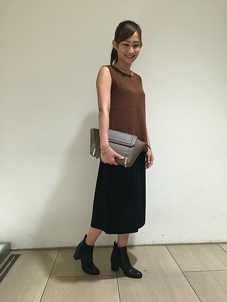 台形ミニと合わせて下半身をスッキリまとめたコーディネート。