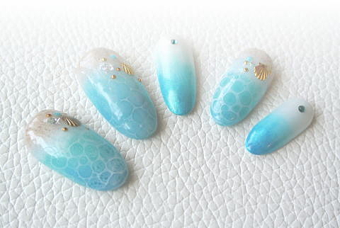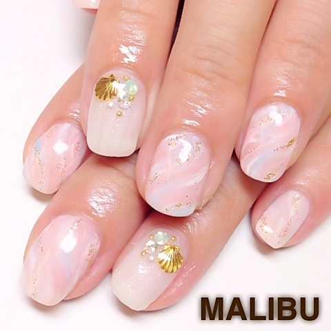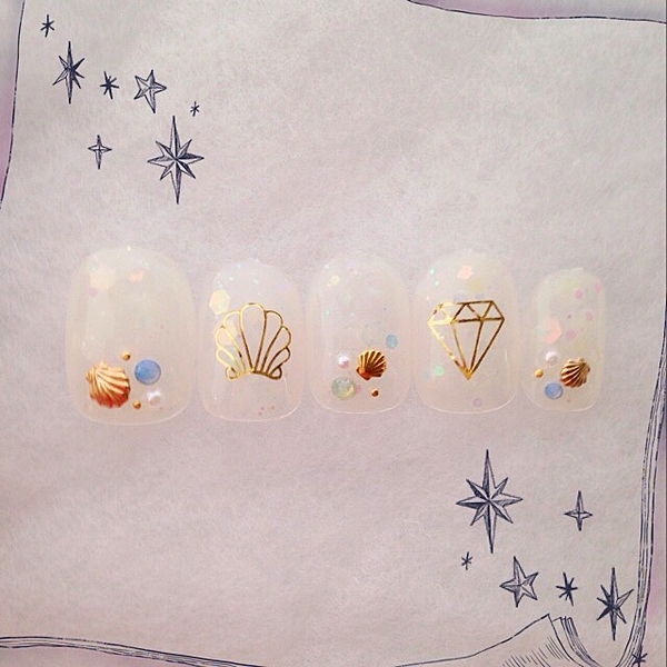 小さな貝殻を沢山散りばめたまさに砂浜なネイル。