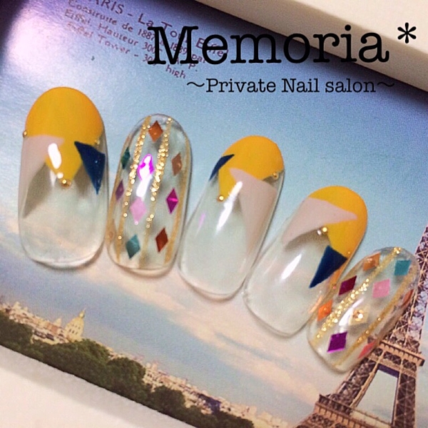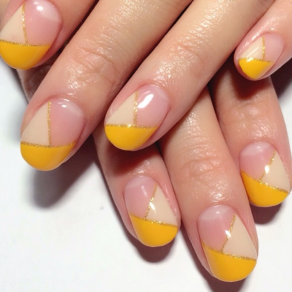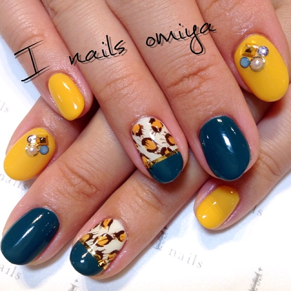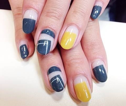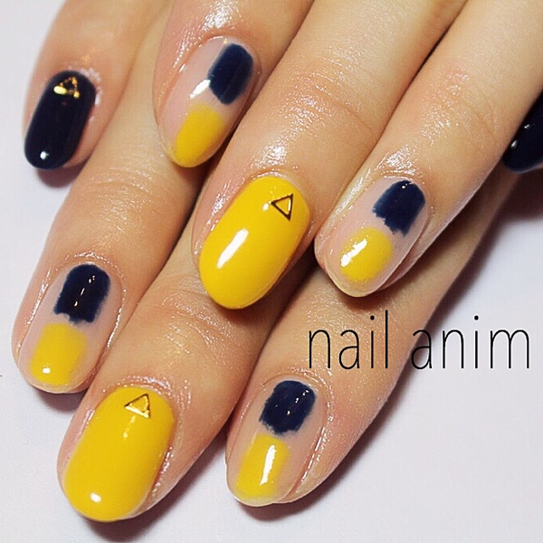 カラフルながらもマスタードイエロー×ネイビーなら大人っぽいネイルに。