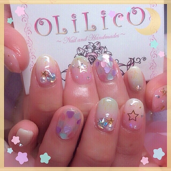 単色ではない、色んな色の入ったラメを使ったラメグラも、可愛すぎる♡ 星の形の、ホログラムとか使ってる、さりげない可愛さもいいですねっ(⁎⚈᷀᷁ᴗ⚈᷀᷁⁎) http://t.co/uu7HiTbatq