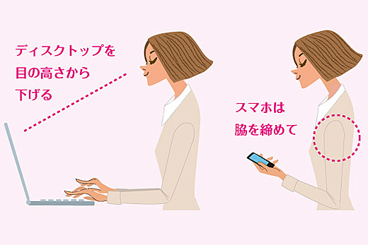 「パソコンのディスプレイは40センチ程度の距離を置き、画面の上縁は目の高さ以下にすること。目線よりも上に画面があると、姿勢も悪くなってしまいます。スマホを触るときも、脇を閉めるように意識すると、肩甲骨の動きにもいい影響がありそうです。そして、肩甲骨を"寄せる""下げる"という動きを日常的に意識することが大切」。