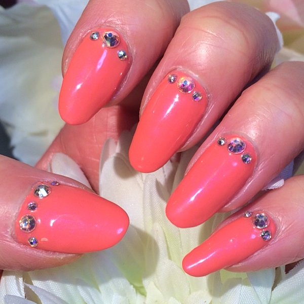 ノーマルカラーのラインストーンはどんなカラーのネイルにも相性バッチリの使い回しの効くアイテムです。一粒でも存在感のあるネイルに。