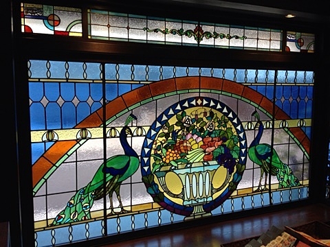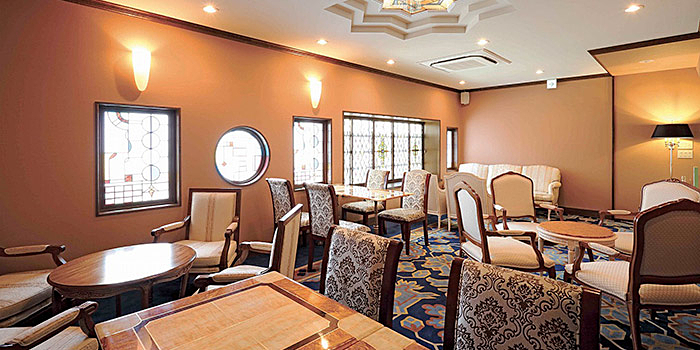 ステンドグラスから光が差し込む店内には、洋風のクラシックな調度品が配され、町家の風情とマッチしている。