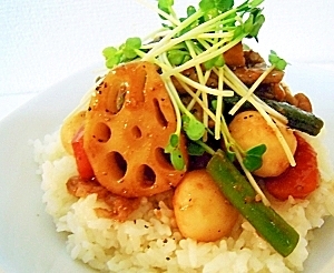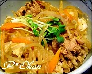 黒酢でコクうま♪豚肉と和風野菜の炒めのせご飯☆