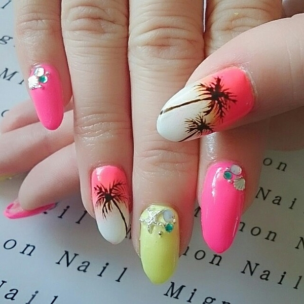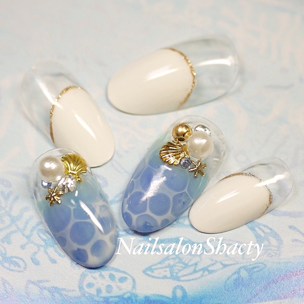 きれいなグラデーションをベースに、落ち着いたリゾートネイルが出来上がります♪
