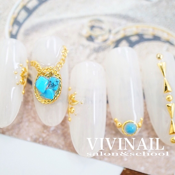 ホワイトベースにグレーのボーダー、ターコイズストーンで一気にマリンネイルに!
